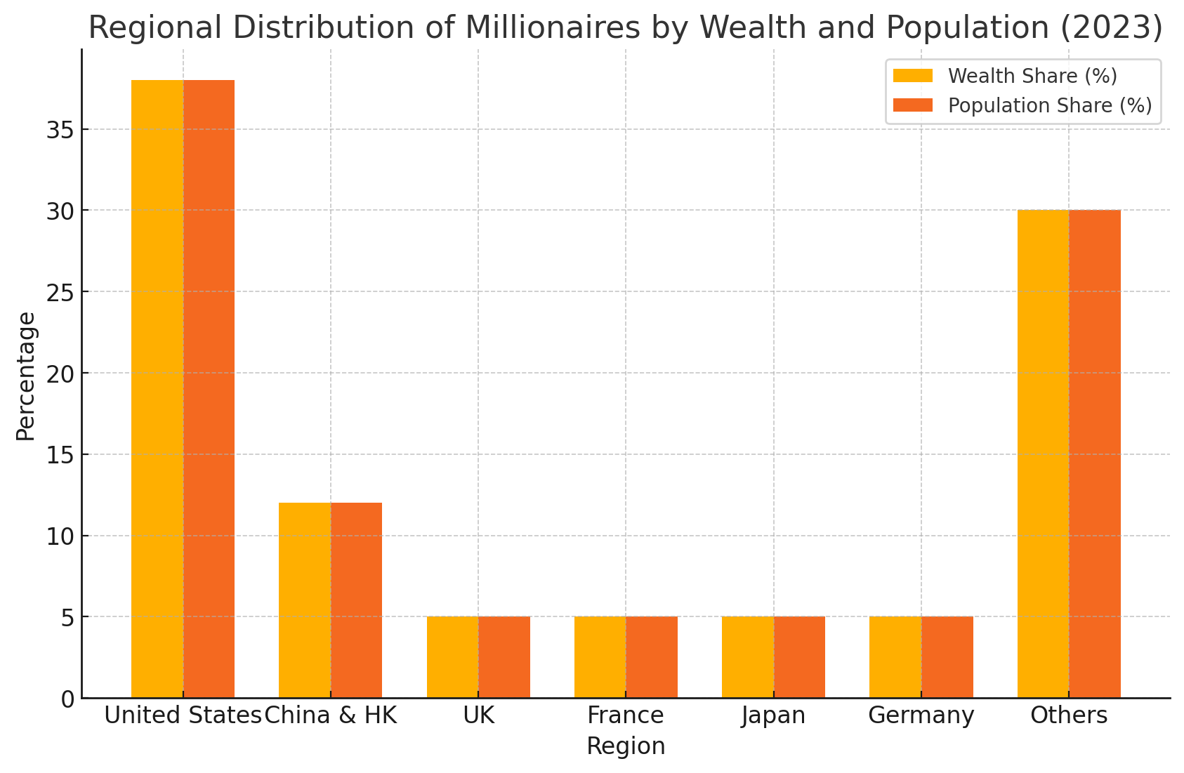 The United States remains the global leader in millionaire and billionaire populations, with U.S.-based millionaires accounting for 38% of the world's HNWI population in 2023, followed by China and Hong Kong (12%). Other significant centers include the U.K., France, Japan, and Germany, collectively holding over two-thirds of global millionaire wealth. The U.S. is forecasted to maintain this lead, with projected HNWI growth in regions across Asia, particularly in Taiwan, Japan, South Korea, and Indonesia.