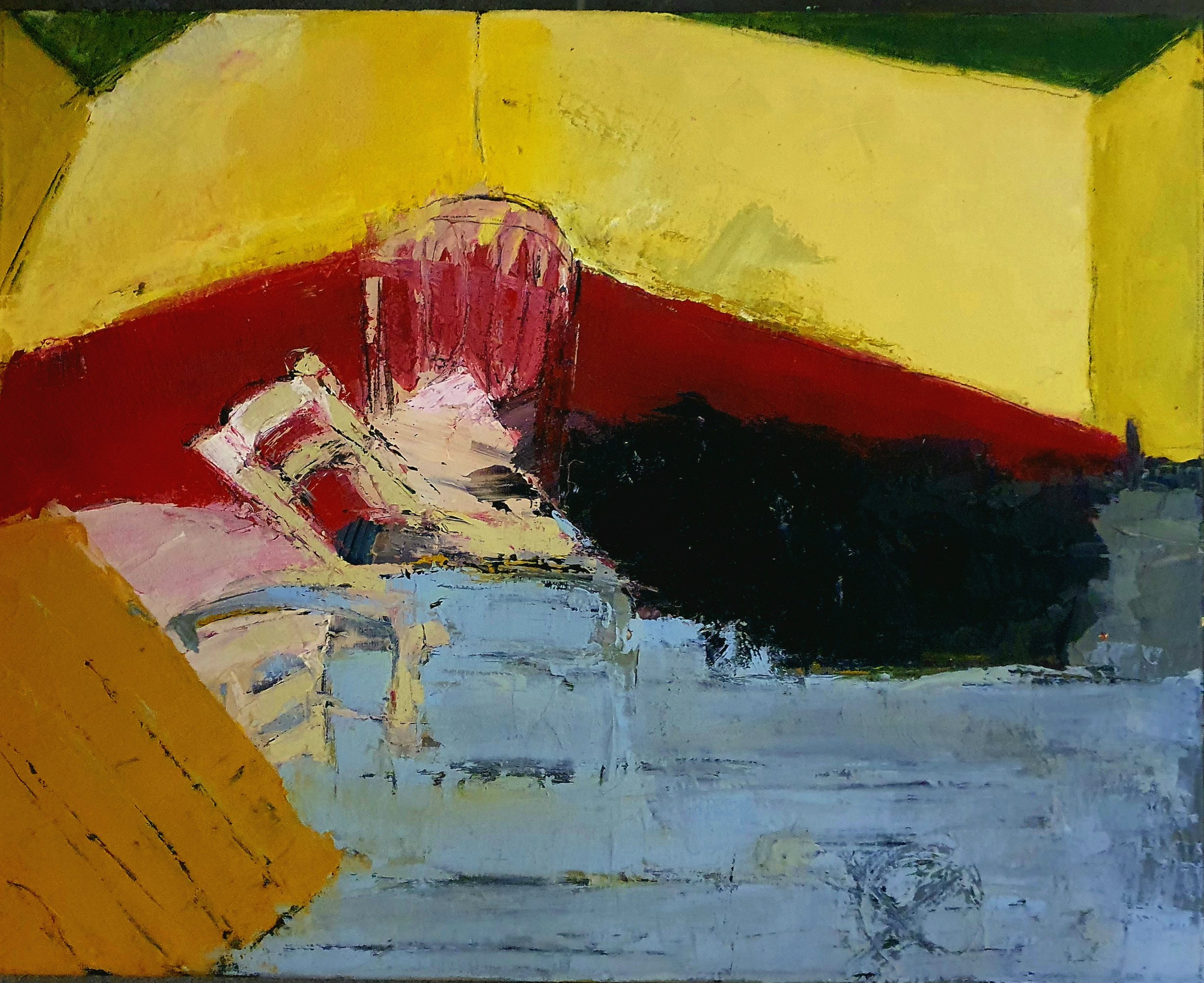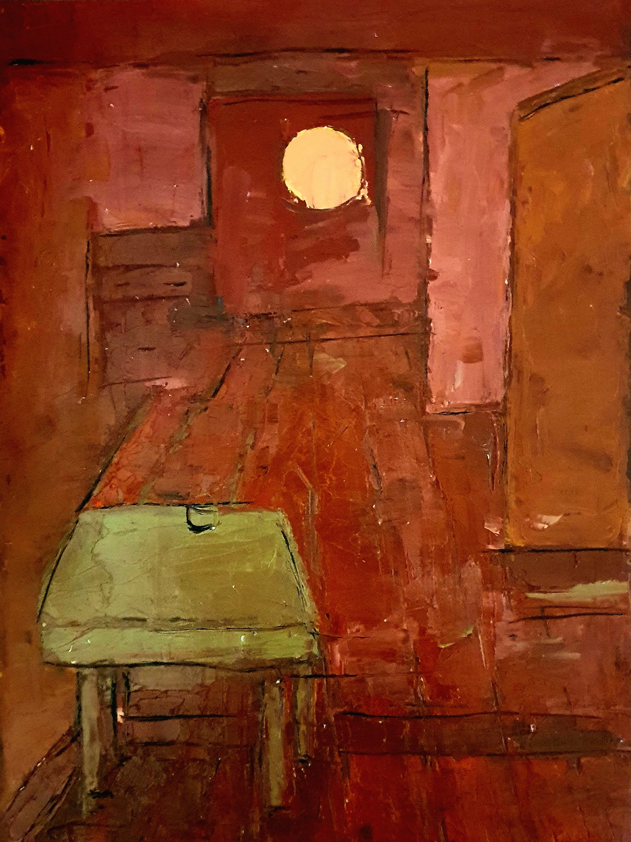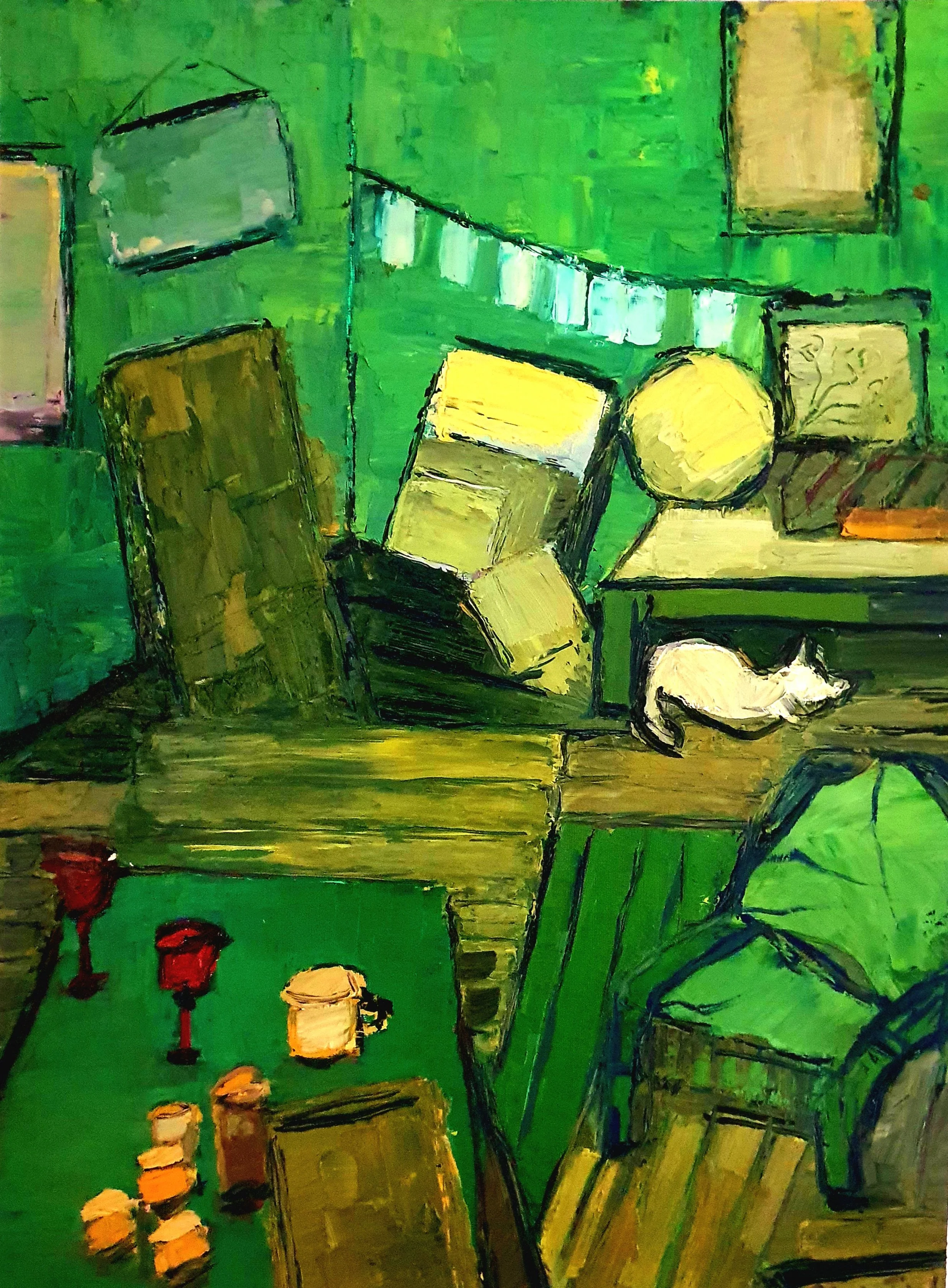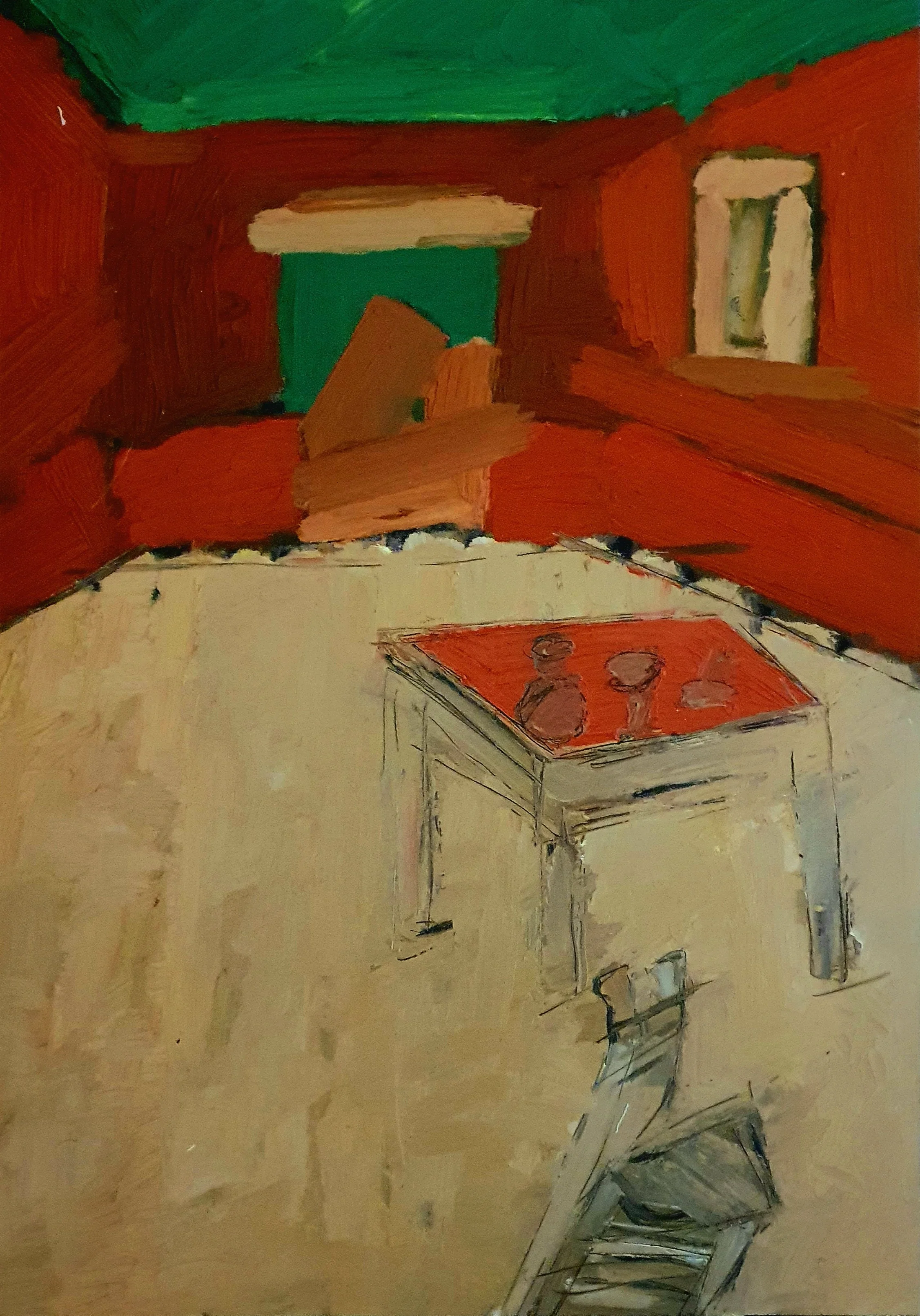 Her paintings are marked by an atmosphere of charged stillness. Interior spaces appear suspended, carrying traces of presence without narrative closure. Rather than illustrating scenes, Tsitsela constructs conditions. Layers of paint are built, disrupted, and partially erased, leaving behind residues that resist stabilization. The surface becomes a site of negotiation, reflecting the instability of memory and the impossibility of fully resolving past experience.