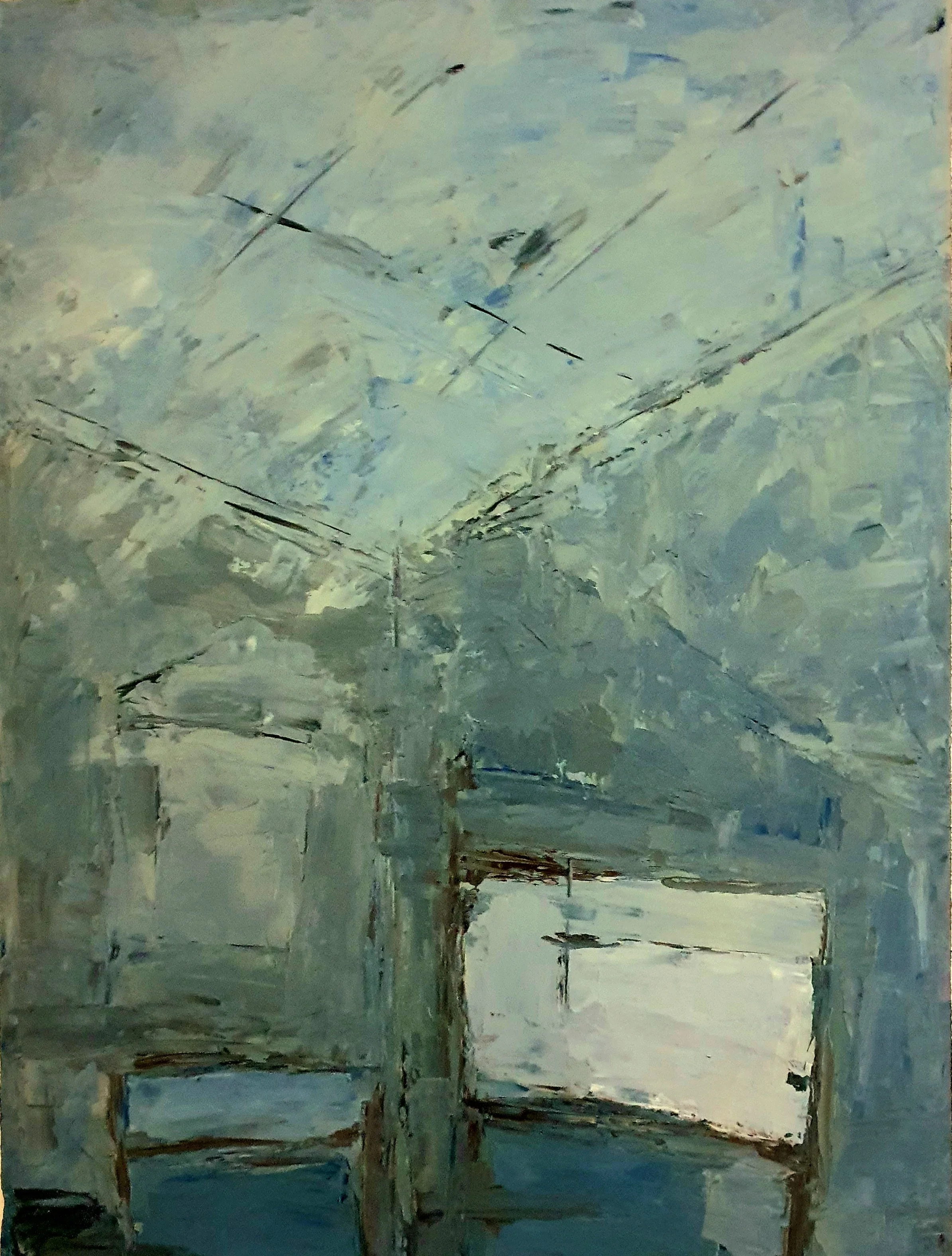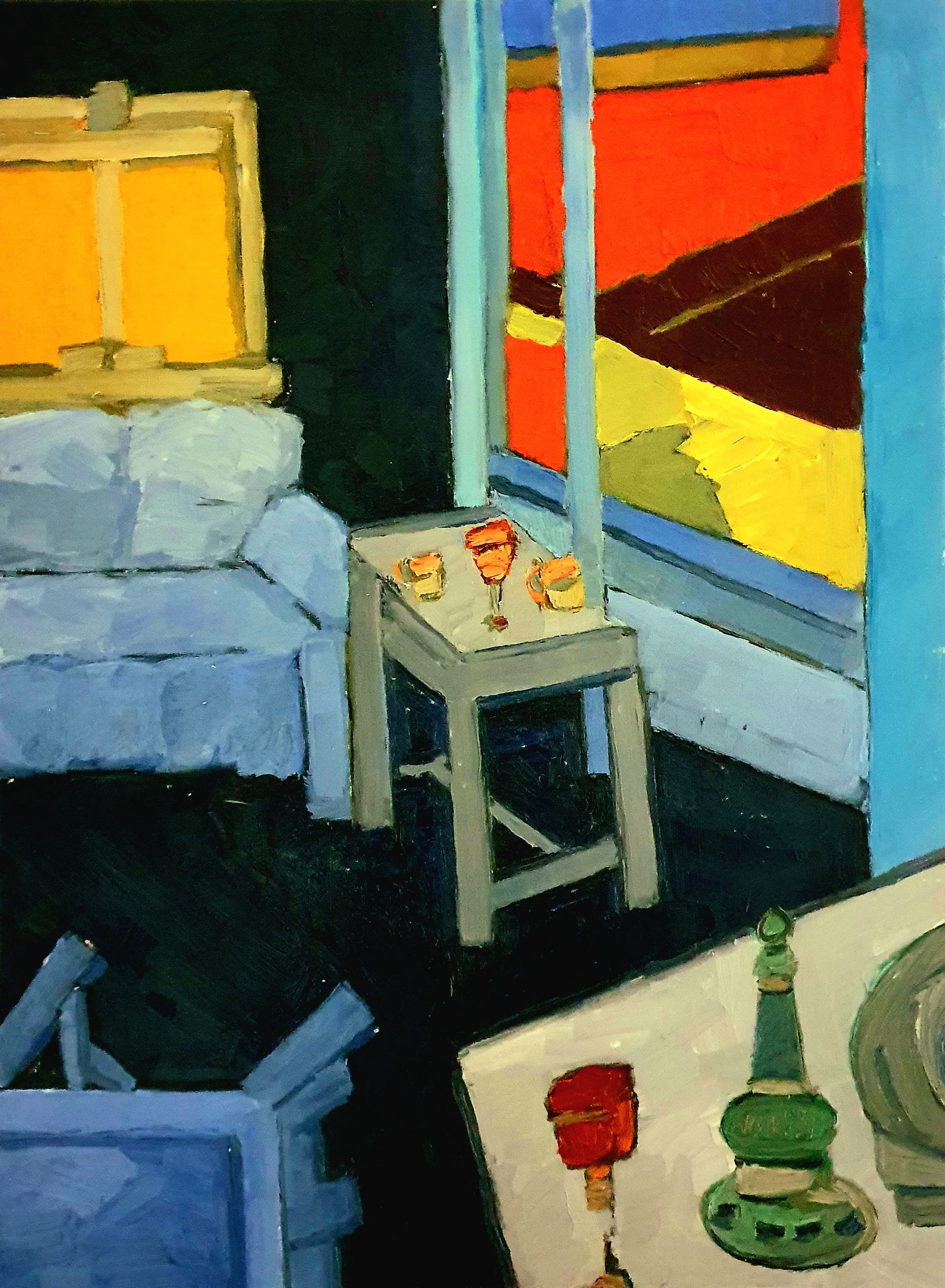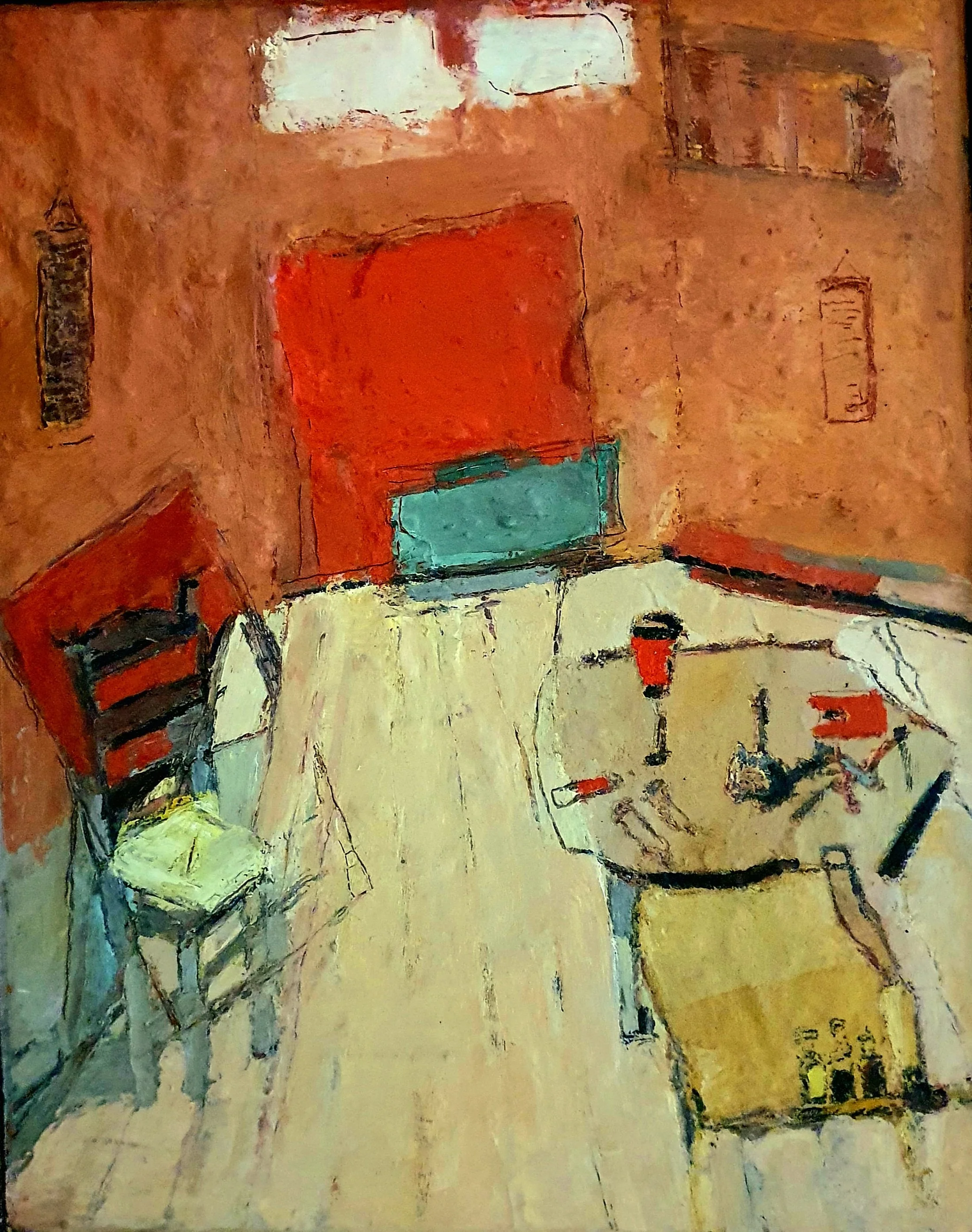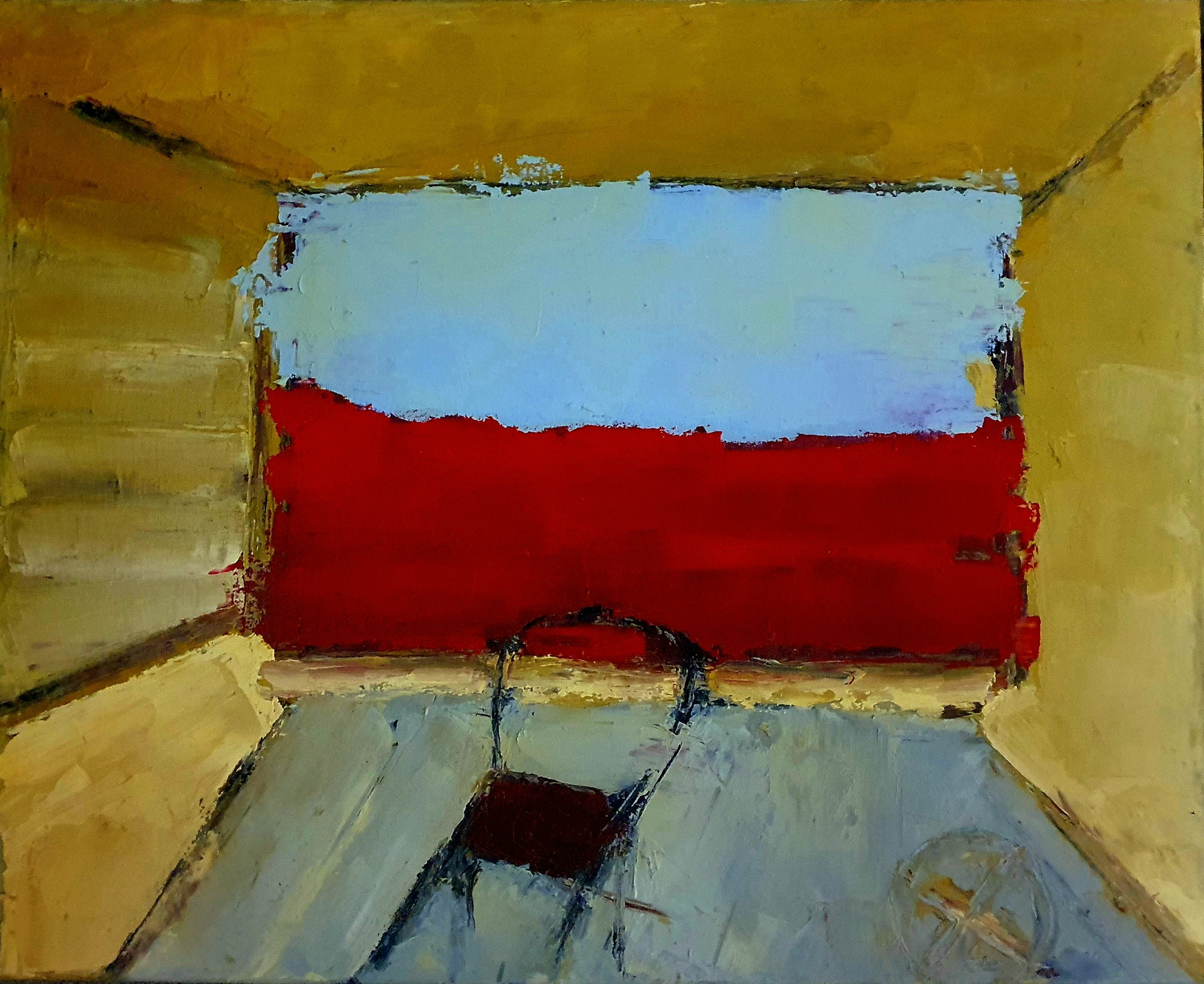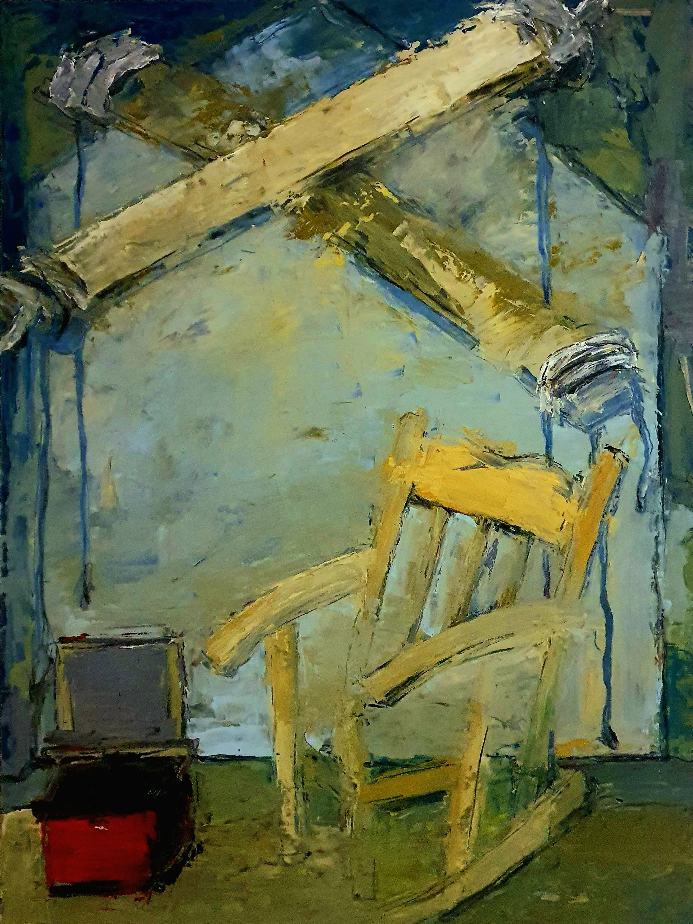 Her paintings are marked by an atmosphere of charged stillness. Interior spaces appear suspended, carrying traces of presence without narrative closure. Rather than illustrating scenes, Tsitsela constructs conditions. Layers of paint are built, disrupted, and partially erased, leaving behind residues that resist stabilization. The surface becomes a site of negotiation, reflecting the instability of memory and the impossibility of fully resolving past experience.