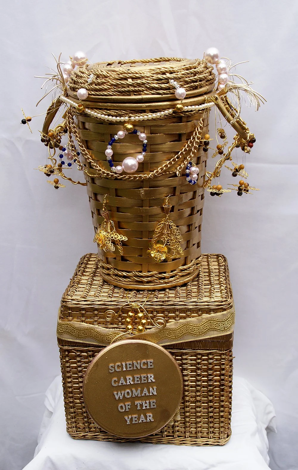 Go for Gold, 2023, Mixed-media (baskets, wooden board, glitter letters, glue, spray paint, aluminium wire, metal beads, metal filigree shape, semi-precious stones, plastic beads, fabric trimmings, leather and ribbon), 120 x 50 x 50 cm (two pieces).