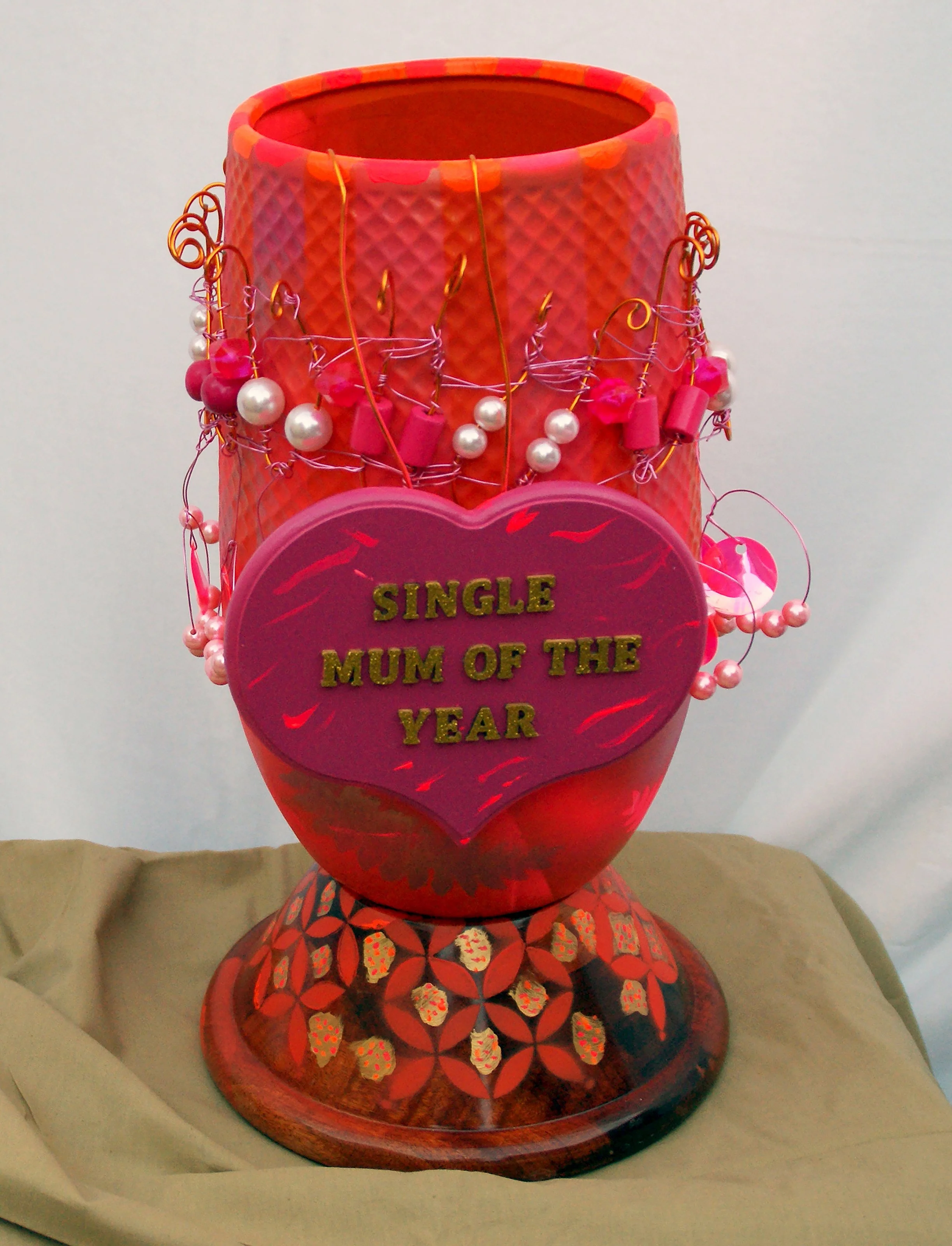Against the Grain, 2023, Mixed-media sculpture (wooden base, ceramic vase, spray paint, paint, wooden board, glitter letters, plastic beads, aluminium wire, sequins), 100 x 40 x 40 cm.