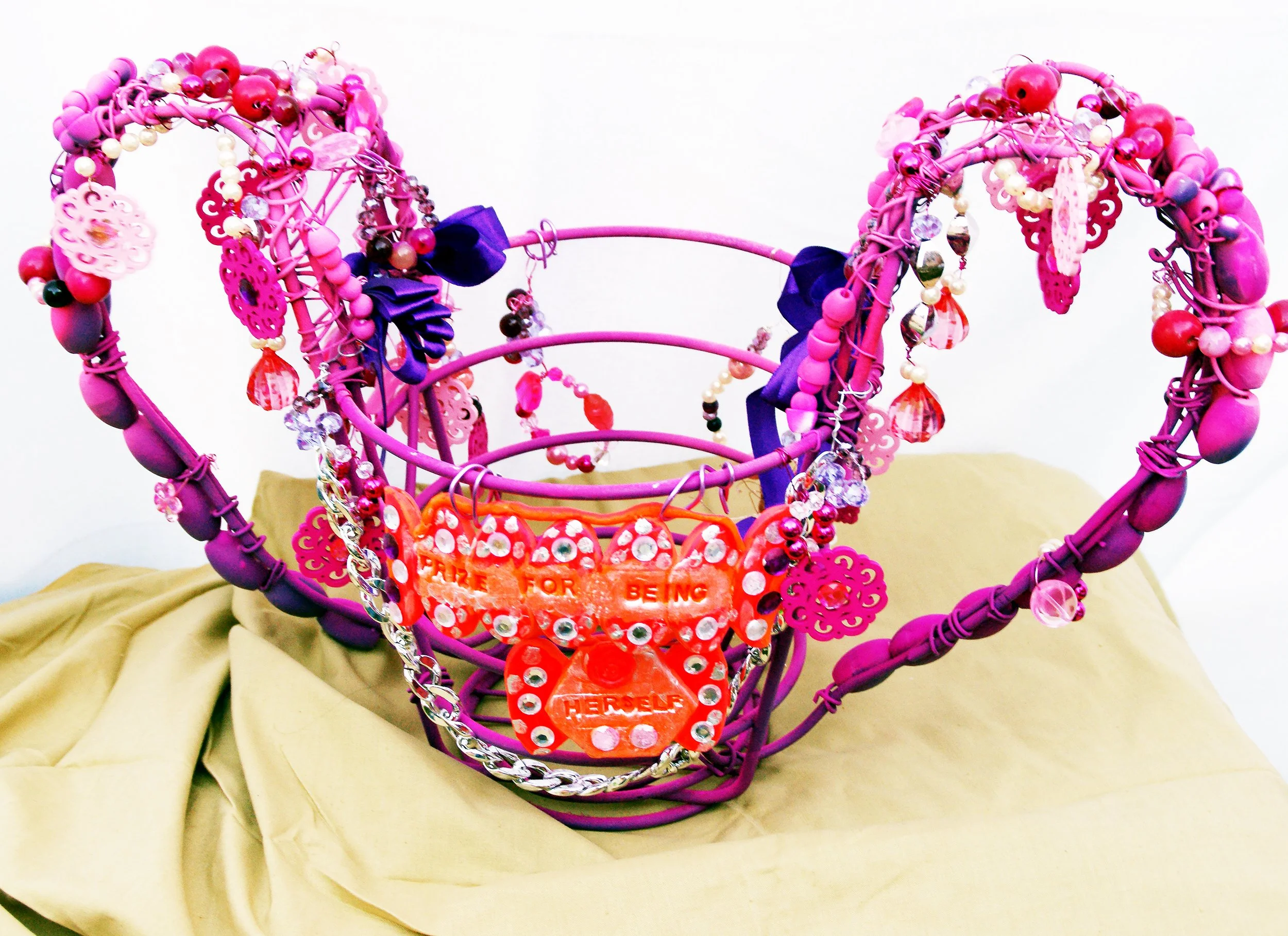 Prize for being herself, 2023, Mixed-media sculpture (metal frame, aluminium wire, ribbon, plastic beads, wooden beads, spray paint, paint, sculpey clay, wooden beads, ceramic beads, semi-precious stones, crystals, diamante, glue and plastic faux chain), 50 x 70 x 40 cm.