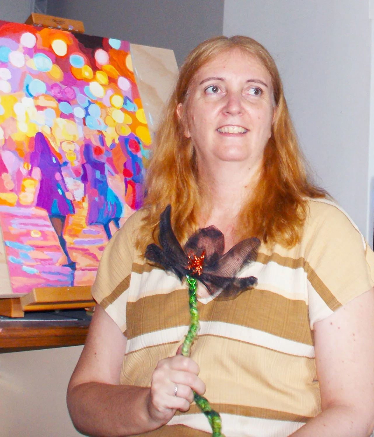 Material experimentation is central to her sculptural work. Drawing on a childhood immersed in textiles and costume, she incorporates elements such as wire, mesh, beads, and semi-precious materials to construct floral and organic forms. These works operate at the intersection of memory and transformation, where familiar materials are reconfigured into intricate structures that evoke both fragility and resilience. The recurring motif of the flower functions less as representation and more as a site of formal and symbolic inquiry.