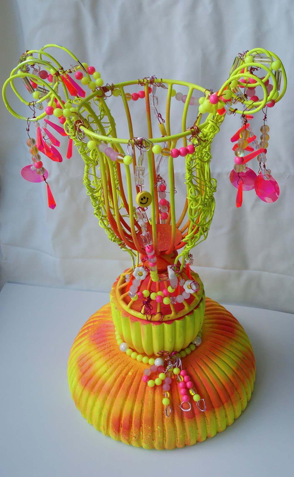 Fluoro Wham Vase with Acid House, 2024, Mixed-media sculpture (wooden base, wire frame, aluminium wire, spray paint, plastic beads, sequins and glass beads), 80 x 50 x 40 cm.