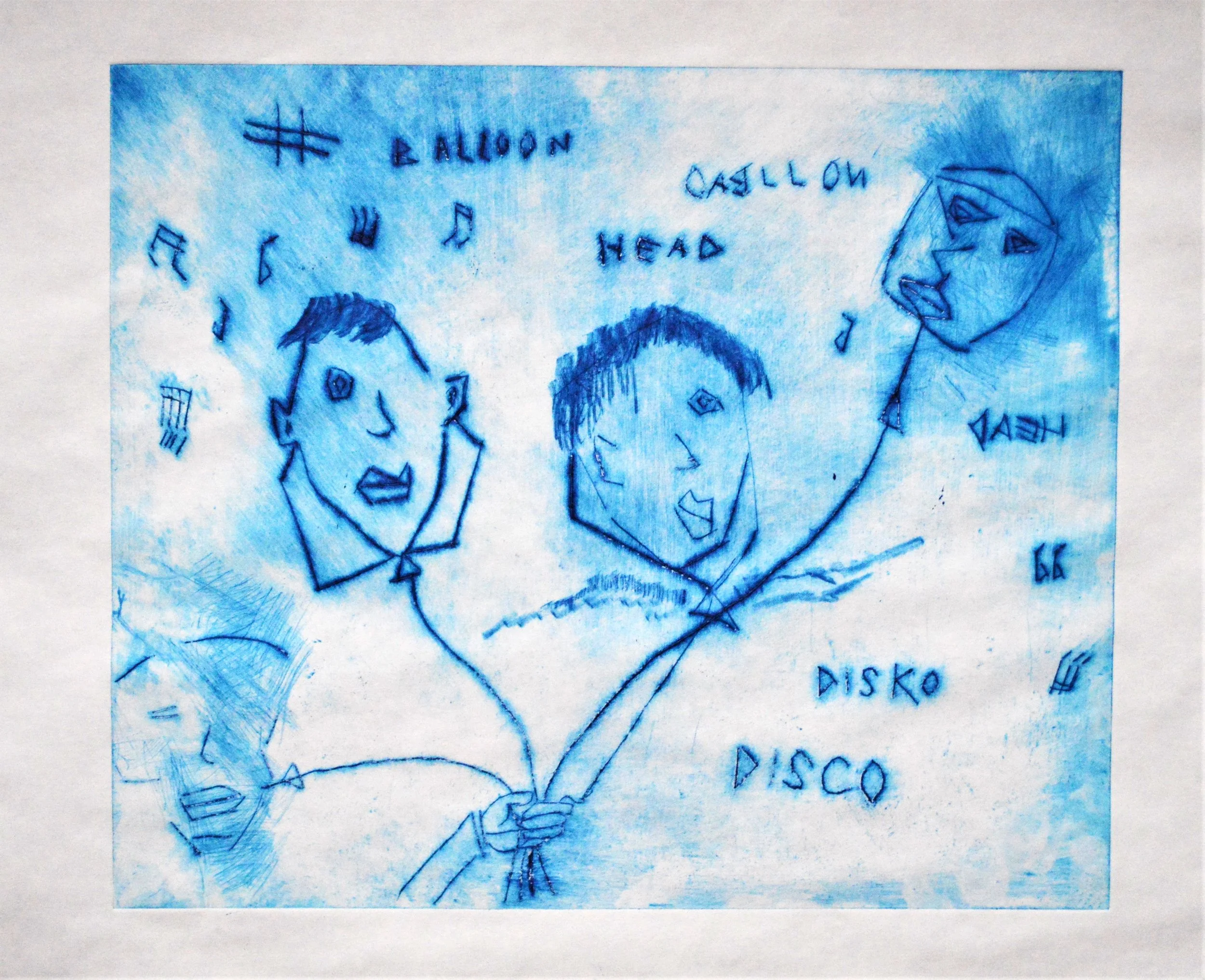 Balloon Disko, 2023, drypoint and acrylic on paper, 30.48x33.02cm.